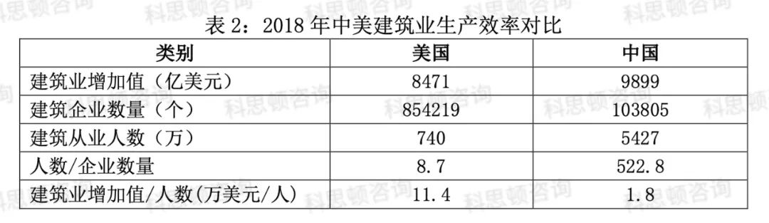 在生产效率方面,中国的建筑企业与美国的建筑企业还有比较大的差距。2018年,美国建筑业增加值为8471亿美元,从业人员740万,人均创造的增加值为11.4万美元;2018年,中国建筑业增加值为9899亿美元,从业人员5427万,人均创造的增加值为1.8万美元,只有美国的15.7%。